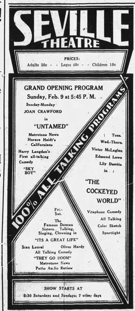 “Last Sunday night marked the opening of one of the finest talkie theatres in Southern California with the introduction of sound at the Seville Theatre,” proclaimed an article on the weekly Star’s front page on the following Friday, February 14.