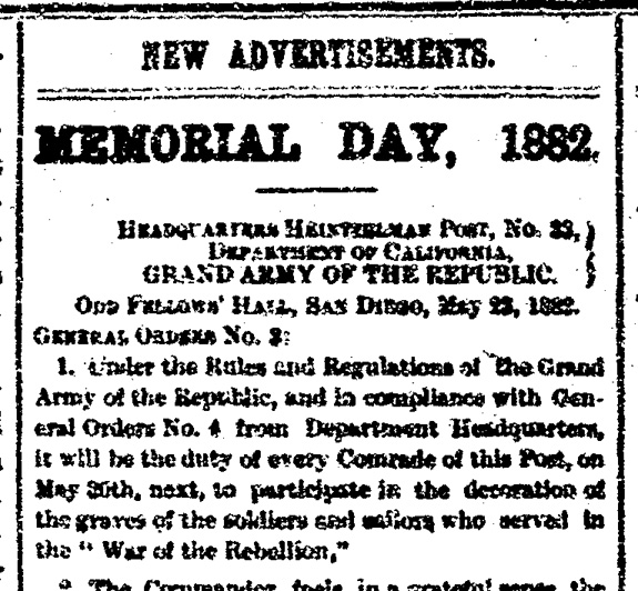 Memorial Day was marked for the first time in San Diego in 1882. As was true elsewhere across the country, the commemoration originated in the last decades of the 19th century with people decorating the graves of Civil War soldiers. A national organization of Civil War veterans, the Grand Army of the Republic, or GAR, played a strong role in honoring its fallen comrades, as shown in the notice above. As preparations for the San Diego commemoration were made, the GAR also invited veterans of an earlier conflict, the Mexican War, to participate.