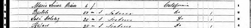 Don Jose and Maria had no children, so it’s possible the three females listed in her household, one adult, one teenager and one child, are members of her extended Alvarado family. There are also three adult males listed only by the first names, consistent with the designation ”I” in a separate column, indicating they are “Indians.” They are also listed as being “Laborers,” clearly part of the rancho workforce. The incomplete names offer another look into what history was left out of this census.