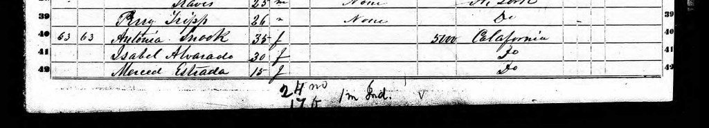 They show the household of Antonia Snook. You can learn a lot of history from census entries, although often, especially if you go back this far in time, you learn more about what had been omitted from history. The number “63” in the far-left column indicates that this was the 63rd dwelling visited by the census takers on their rounds through that particular enumeration district. The first person enumerated at that dwelling is Antonia Snook. The two columns to the immediate right of her name list her as 35-year-old female.