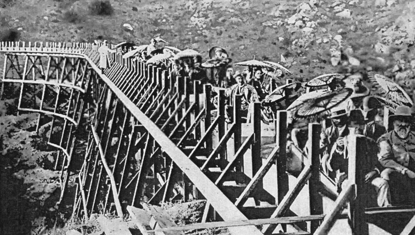 Here’s a photo from the 1908 book History of San Diego: 1542-1908 by William E. Smythe showing a delegation of officials in flat-bottom boats riding the flume as part of the dedication ceremony. The bearded man sitting on the far right in front is then-California Governor Robert Waterman.