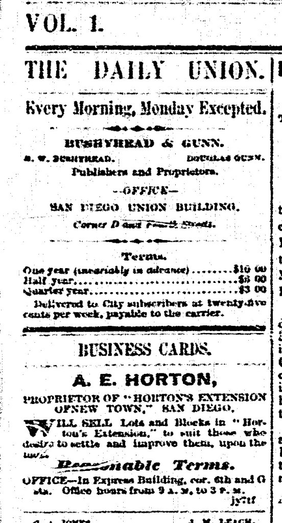 The emergence of “New Town” is evident in the clip immediately below the paper’s masthead, displaying the “Business Card” of Alonzo Horton, who had purchased 900 acres in 1867 and begun developing it under various names including “Horton’s Extension” or “Horton’s Addition,” with the support of many in the then-small city (population less than 3,000), including Douglas Gunn and his newspaper.