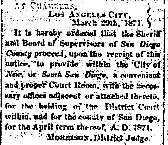 Below is a clipping of part of the front page of the San Diego Union issue of March 20, 1871.