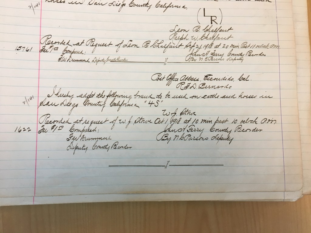 In addition to growing hay and grain, Stowe intended to keep a large herd of cattle. Livestock was big business in San Diego County at the time. Like all other livestock ranchers, Stowe had to register a brand for his livestock with the county. Below is an excerpt from the page of the county brand book for October 1, 1918 recording Stowe’s appearance: