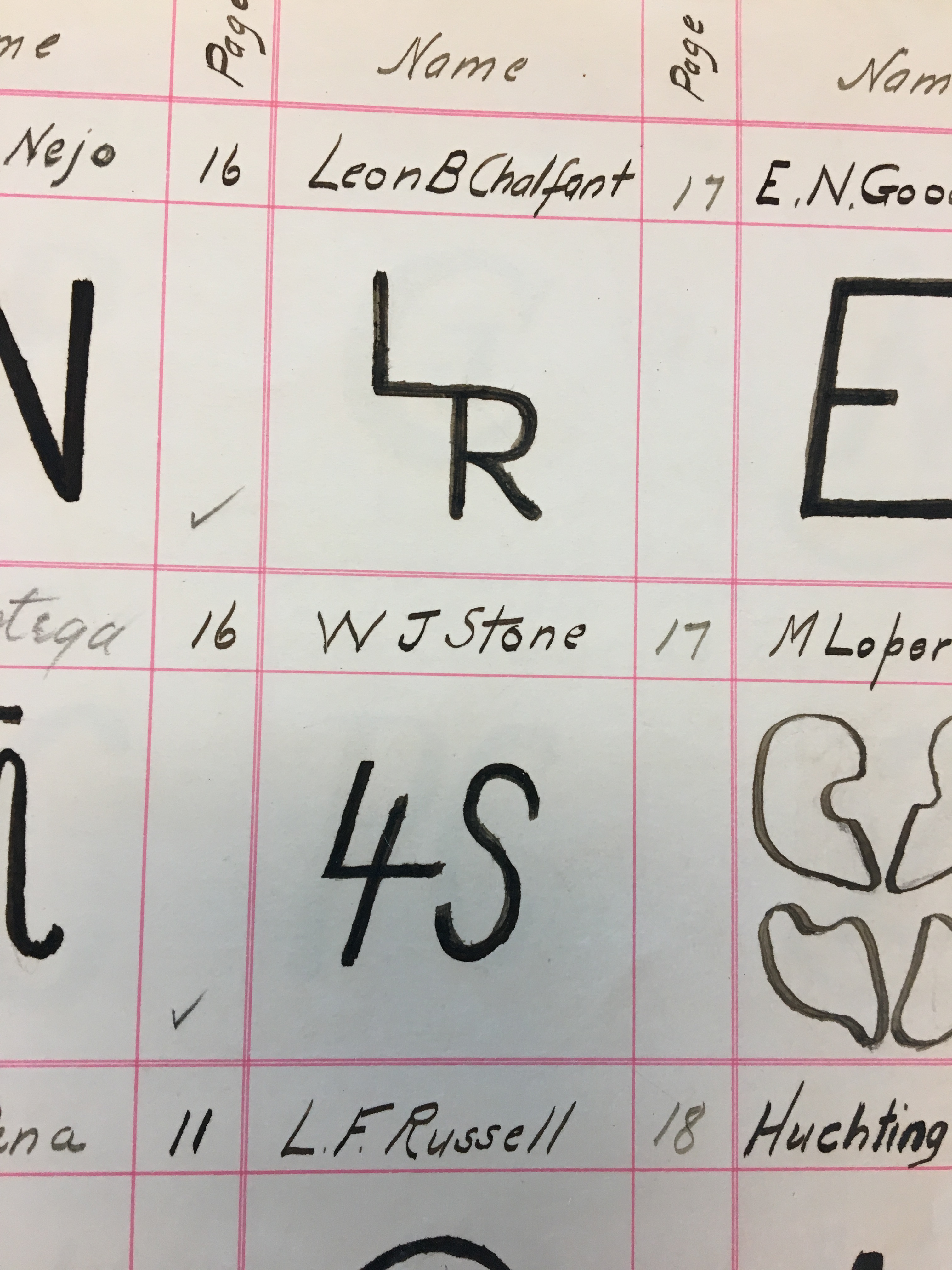 Portion of table of contents of 1918 San Diego County Brand Book showing the livestock brand registered to W. J. Stowe (misspelled Stone here). Courtesy of History Office, San Diego County Department of Parks and Recreation.