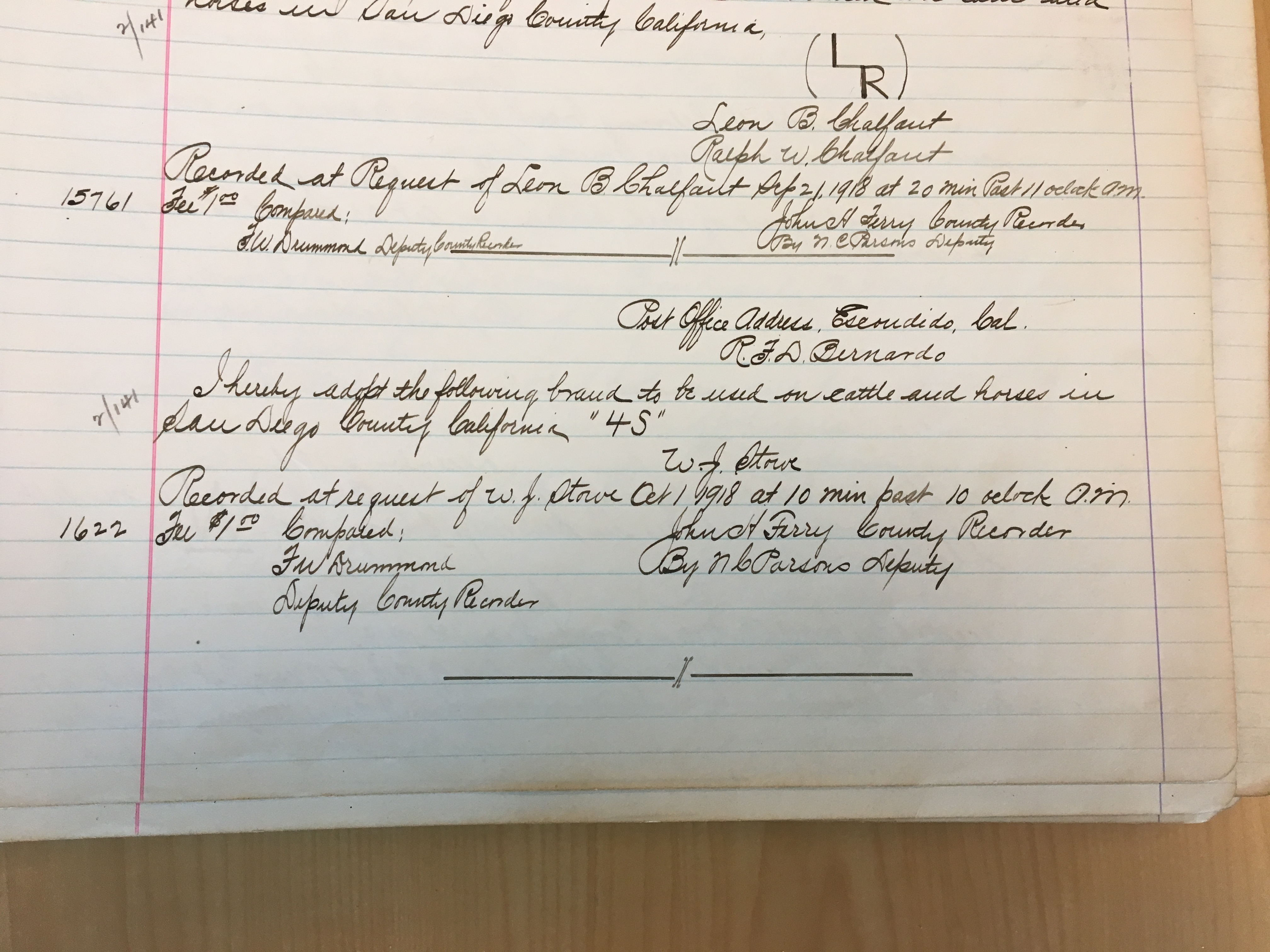 In addition to growing hay and grain, Stowe intended to keep a large herd of cattle. Livestock was big business in San Diego County at the time. Like all other livestock ranchers, Stowe had to register a brand for his livestock with the county. Below is an excerpt from the page of the county brand book for October 1, 1918 recording Stowe’s appearance: