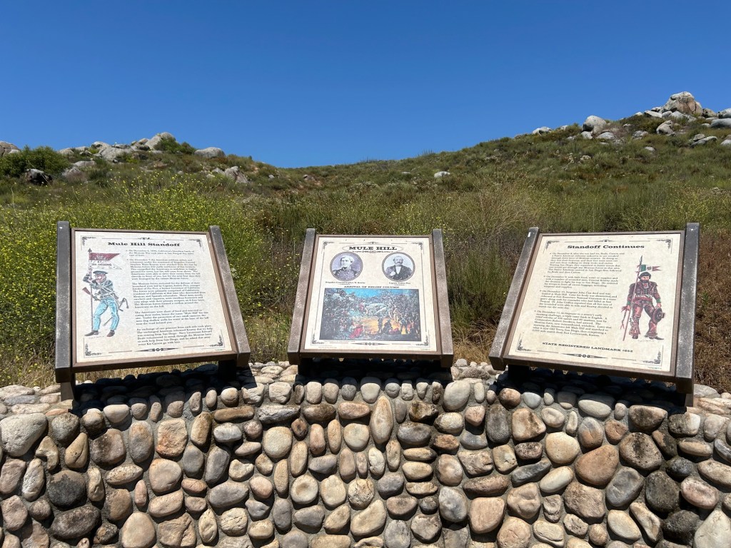 The stone wall and historical markers look out on Mule Hill, site of the climactic final stage of the Battle of San Pasqual in 1846, during the Mexican-American War. The US victory in that war in 1848 would transform California from a Mexican province to an American state.