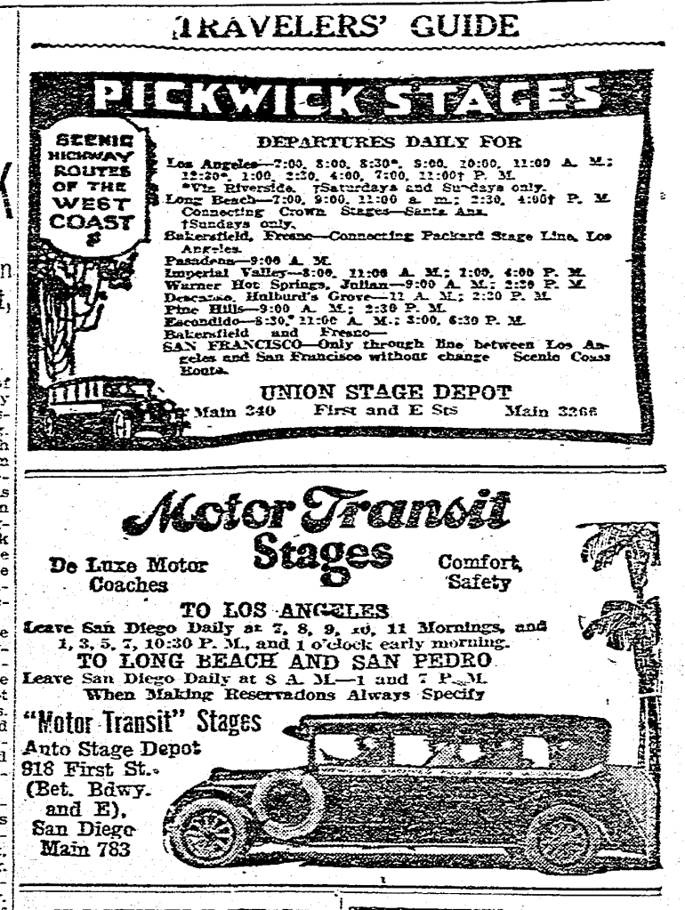 But for a few decades at least, the term “stage” apparently survived the transition from the original horsepower to gasoline-fueled horsepower. Here’s an ad below from The San Diego Union of April 28, 1924: