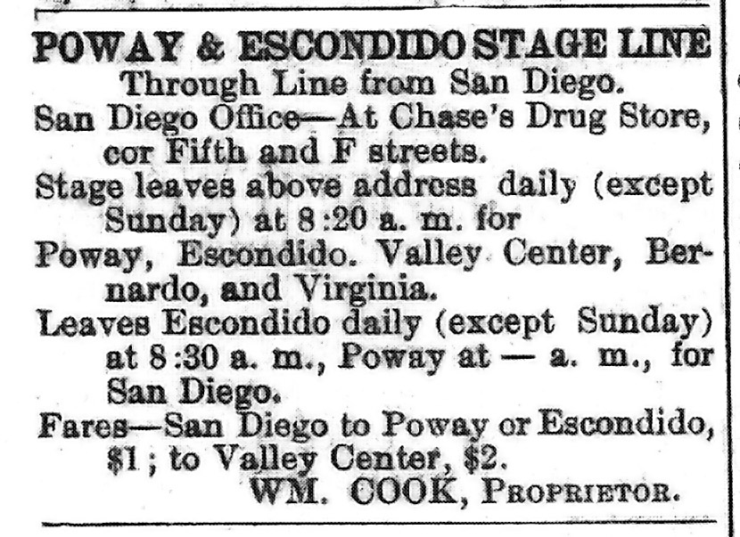 Above is an ad from the Poway Progress newspaper of February 10, 1894, typical of ads for stagecoach schedules that appeared in San Diego city and county newspapers in the stagecoach era.